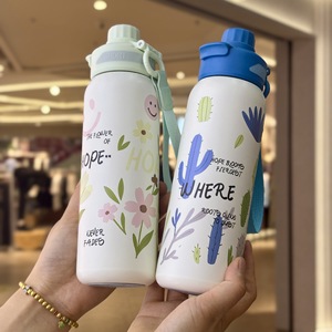 新款高颜值大容量便携提绳不锈钢保温杯清新印花一盖双饮直身水杯