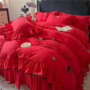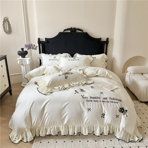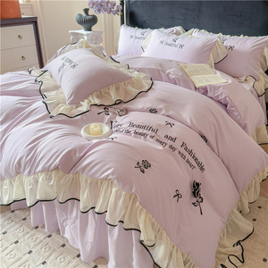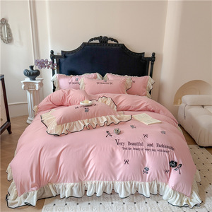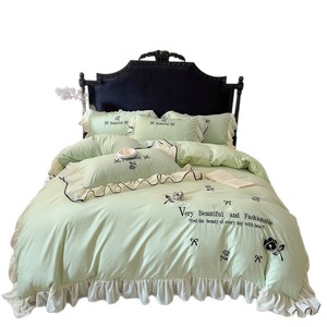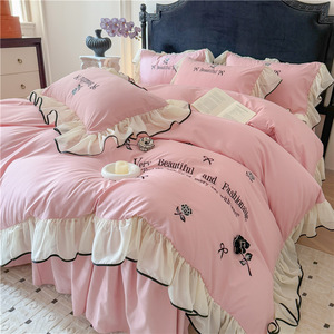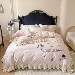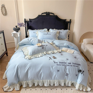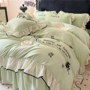 跨境轻奢亲肤水洗棉刺绣床裙款四件套韩版法式公主风床单笠四件套