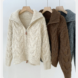 韩版双拉链麻花纹毛衣外套女2025冬季设计感翻领加厚长袖针织开衫