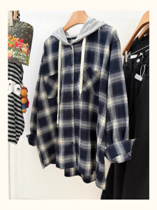 美式连帽衬衫薄外套女2025秋季慵懒BF风复古宽松显瘦长袖格子上衣