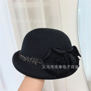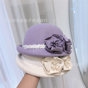 新款法式优雅立体花朵羊毛呢贝雷帽女秋冬日系百搭名媛卷边小礼帽