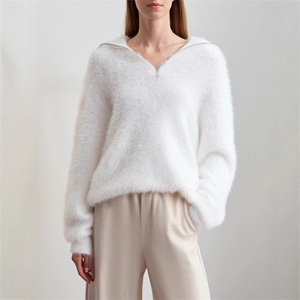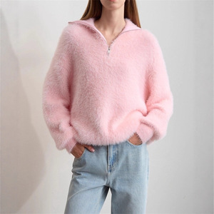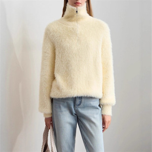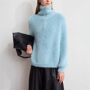 欧美跨境仿水貂绒针织衫女2025秋冬高领拉链开襟落肩袖毛衣专供