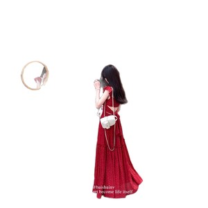 海边度假风红色波点连衣裙女装夏季2025新款系带收腰显瘦A字长裙