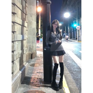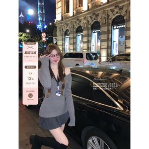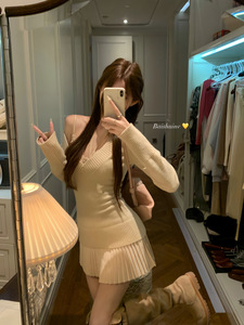 白水女 高智感姐姐 V领毛针织衫女薄款毛衣百褶裙韩系套装上衣