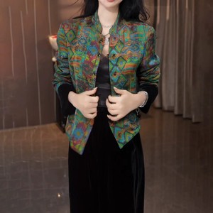 新中式国风高档盘扣黑色外套女2025秋季新款复古印花时尚宽松上衣