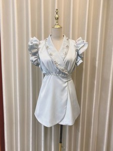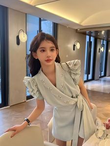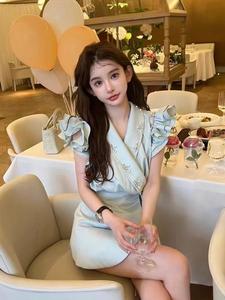 名媛气质减龄手工钉珠系带连衣裙潮小香风重工钉钻花朵荷叶袖短裙