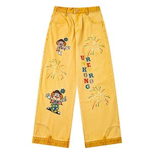 美式复古卡通刺绣直筒牛仔裤男女小众设计感宽松休闲个性阔腿裤