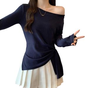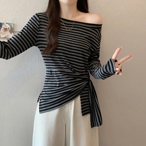 大码女装2025秋季新款不规则设计感收腰条纹甜辣长袖T恤黑色