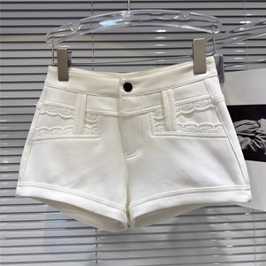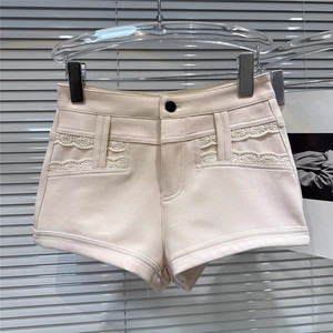 2025秋季新款甜美气质蕾丝花边口袋设计纯色三分短裤修身百搭裤子