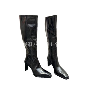 高端2025秋冬真皮方头复古粗高跟侧拉链高筒显瘦骑士靴不过膝长靴