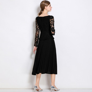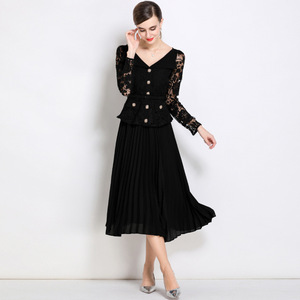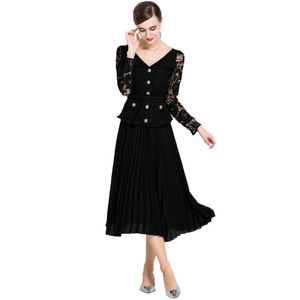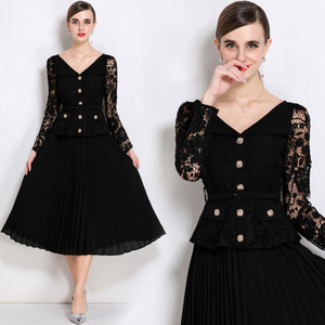 法式蕾丝拼接翻领连衣裙金属扣收腰显瘦百褶中长裙送腰带