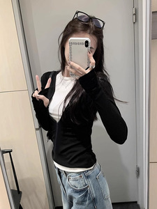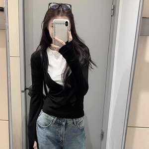 J典黑白撞色 |假两件设计 |美式穿搭小个子修身短款长袖上衣女秋