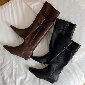 2025秋冬复古方头小坡跟侧拉链长筒靴皮带扣褶皱宽筒显瘦女长靴子