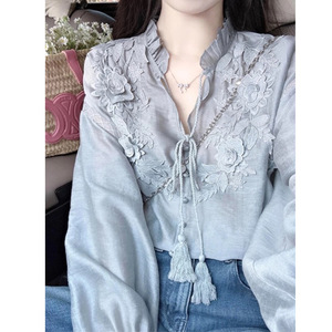 法式气质刺绣花朵设计感长袖衬衫女早秋宽松显瘦衬衣百搭上衣秋季