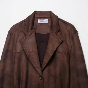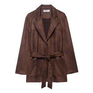 跨境欧美女装速卖通爆款时尚休闲翻领配腰带反绒皮效果夹克外套
