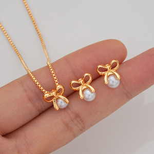 蝴蝶结珍珠耳环项链套装(环保)合金 金色