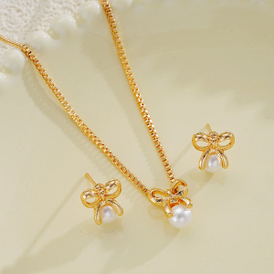 跨境欧美新款蝴蝶结珍珠镶嵌优雅轻奢项链耳环时尚简约高级感套装