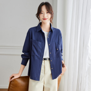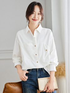 厂家直销 极简韩风折边口袋衬衫女秋气质百搭小个子翻领纯棉衬衣