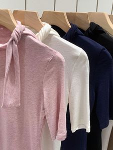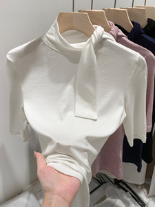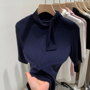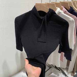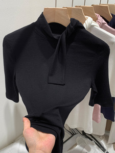 莱赛尔天丝羊毛独特半高领系带中袖t恤女夏季高级感chic别致上衣