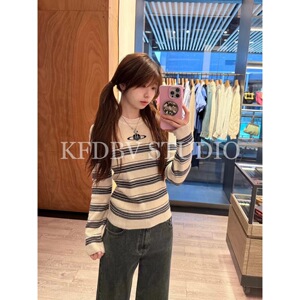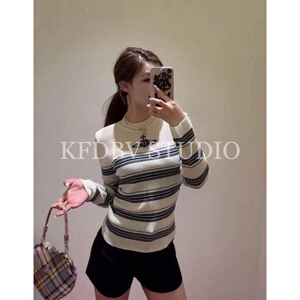 撞色条纹土星刺绣款针织长袖内搭修身显瘦圆领套头上衣
