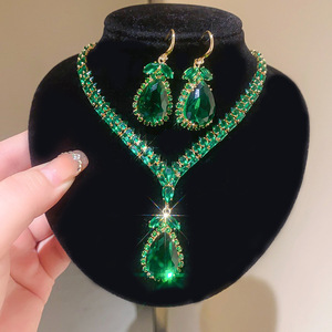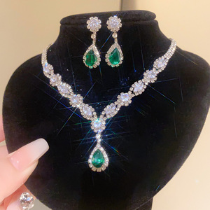 13#绿色锆石水滴耳钩项链(两件套)