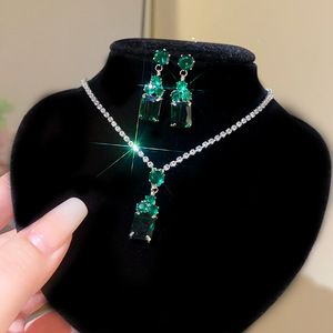 7#绿色锆石圆形方形耳钉项链(两件套)