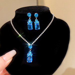 9#蓝色锆石圆形方形耳钉项链(两件套)