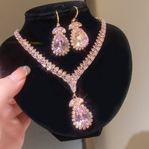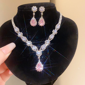 3#粉色锆石水滴耳钉项链(两件套)