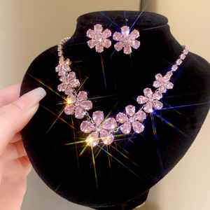 4#锆石粉色花朵水滴耳钉项链(两件套)