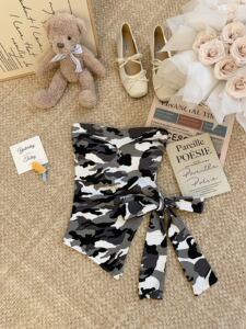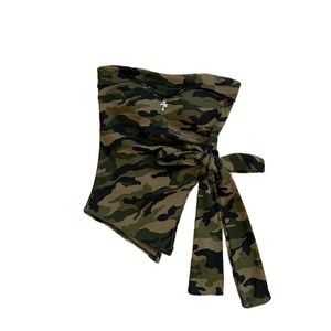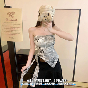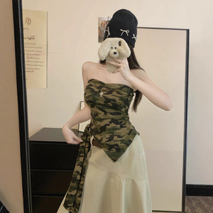 十三行美式复古辣妹风迷彩印花抹胸背心女荷叶边飘带收腰显瘦上衣