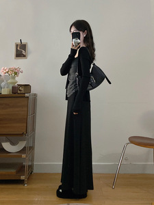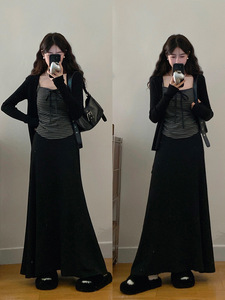 2025年大码女装韩系松弛黑色开衫条纹吊带背心+高腰显瘦半裙套装