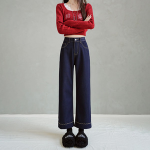 抗皱免烫四面弹宽松垂顺绣花阔腿牛仔裤显瘦百搭休闲裤九分奶奶裤