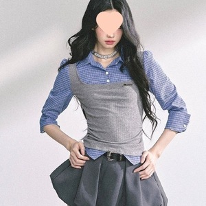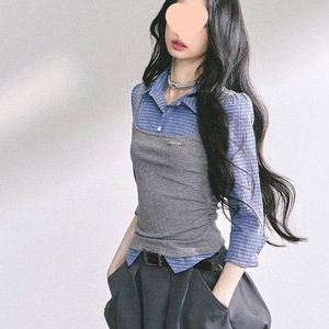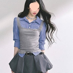 2025年秋季假两件拼接格子衬衫+辣妹花苞裙两件套女格子拼接衬衫