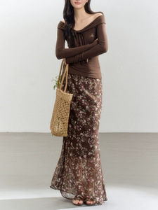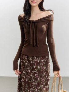 绑带一字肩棕色修身长袖上衣女针织别致露肩飘带短款T恤