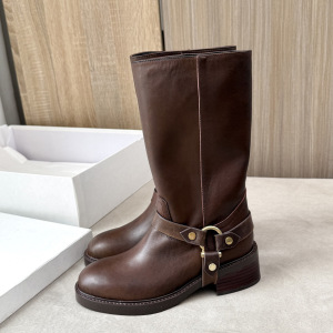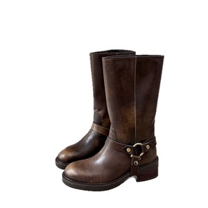 2025秋冬新款金属扣圆头厚底增高骑士靴女复古真皮粗跟长筒靴