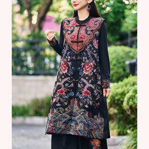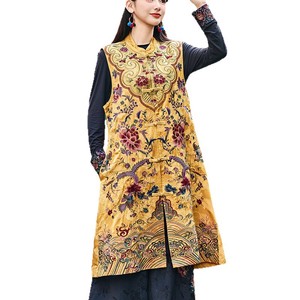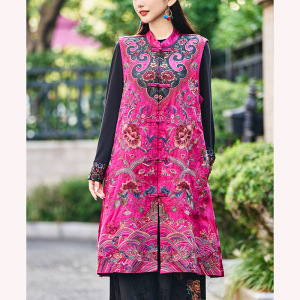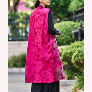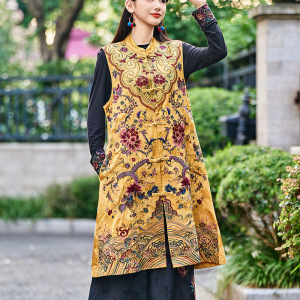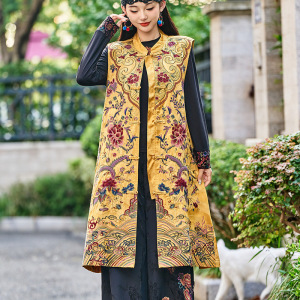 2025秋季新款复古立领盘扣拼接纯色民族风刺绣缎面中长款无袖马甲