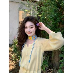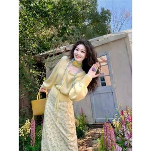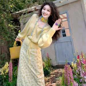 韩系早秋穿搭绝美多巴胺碎花半身裙针织上衣黄色氛围感两件套裙子