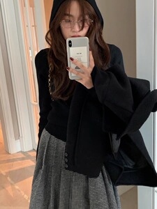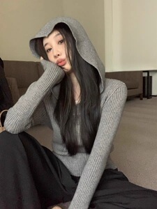 小香风复古灰色连帽卫衣毛衣外套女秋冬新款百搭针织衫配大衣上衣