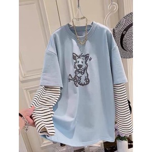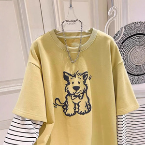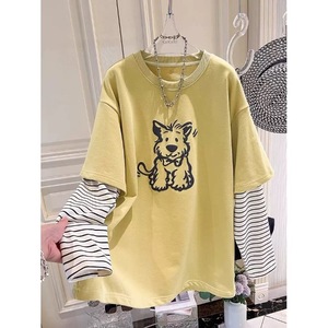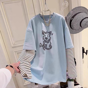 特大码300斤时尚早秋季新款卡通减龄薄款假两件女宽松圆领T恤上衣