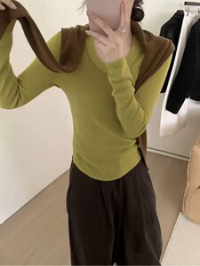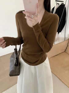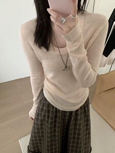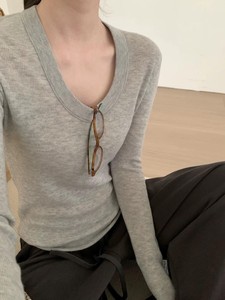 U粒-秋季女韩系简约基础款日常通勤修身显瘦U领长袖打底针织衫901