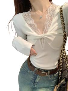 2025年秋季新款线条设计感蕾丝拼接V领打底衫女复古收腰内搭上衣1