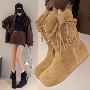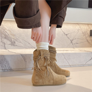 复古废土风流苏骑士靴平底短靴女2025秋冬新款显瘦堆堆中筒靴女