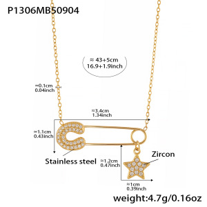 谜丽 镶钻锆石别针闪亮镀18k金锁骨链不锈钢百搭个性回形针项链