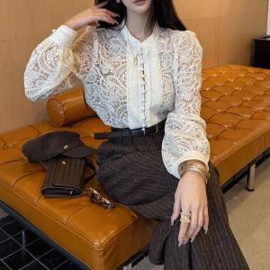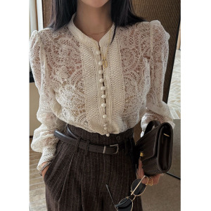 发华厂2025秋季新【清韵浮白】白色镂空长袖开衫修身气质雪纺衫女