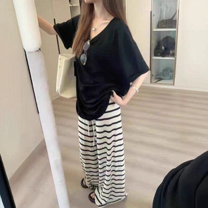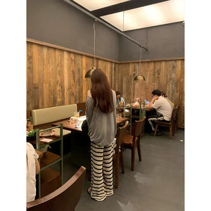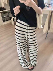 MosesQueen美式基础撞色条纹印花阔腿裤宽松显瘦百搭辣妹拖地长裤