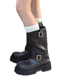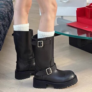牛皮休闲百搭皮带扣骑士靴女款中筒靴子2025秋冬新款真皮女靴