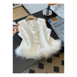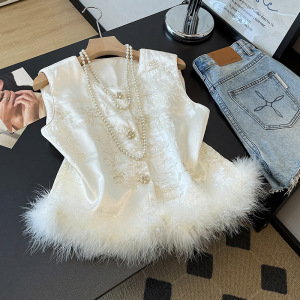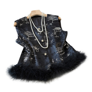 实拍新中式国风鸵鸟毛刺绣马甲外套女秋季坎肩复古无袖外套上衣女