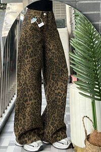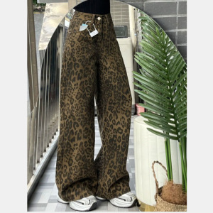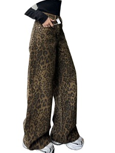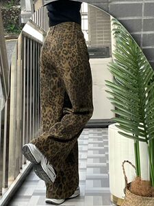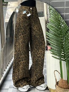 美式复古阔腿豹纹高腰2025春秋牛仔高街新款显瘦宽松直筒拖地ins