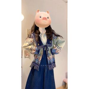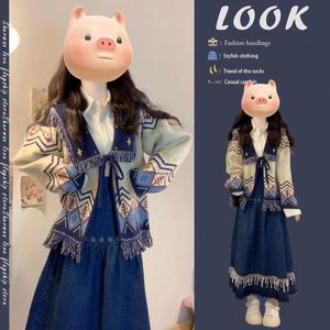 2025秋冬新款慵懒复古费尔岛毛衣外套百搭衬衫牛仔半身裙三件套装