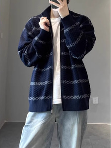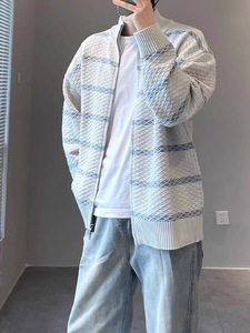 韩系简约慵懒条纹针织开衫男学院风通勤宽松休闲百搭立领毛衣外套